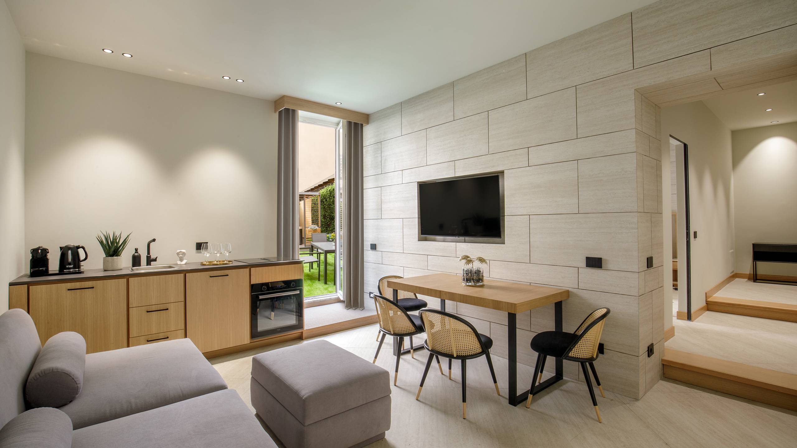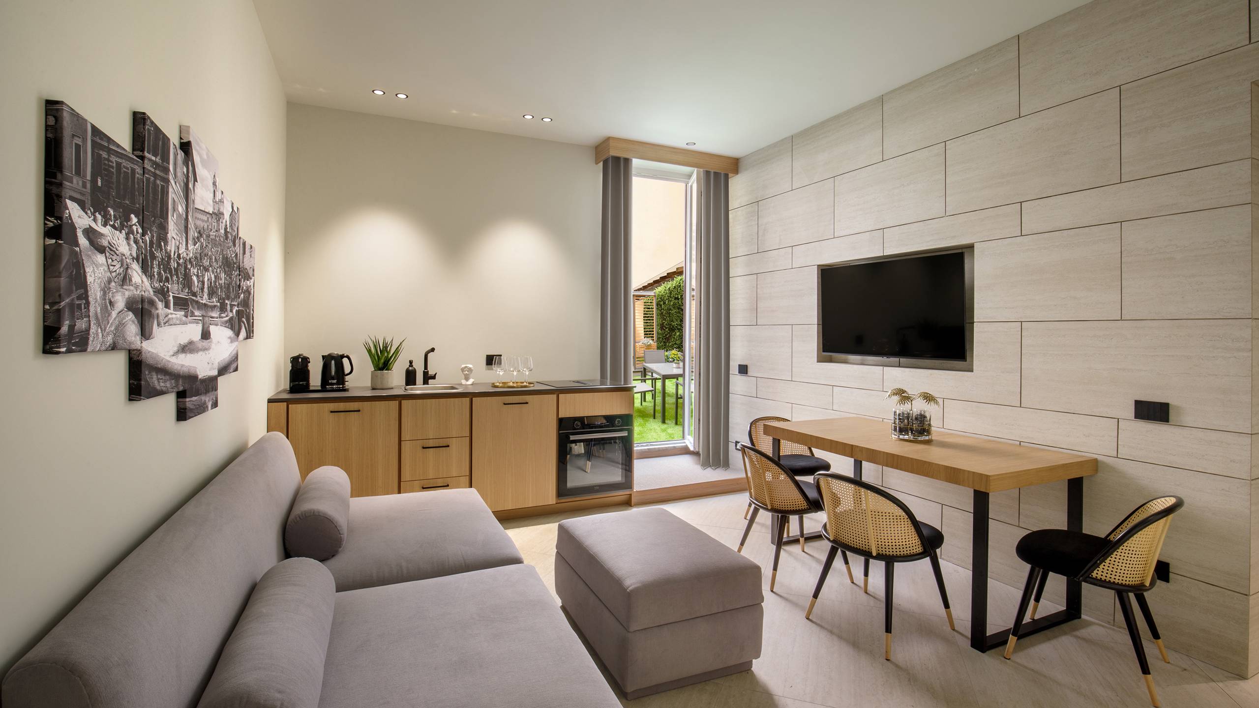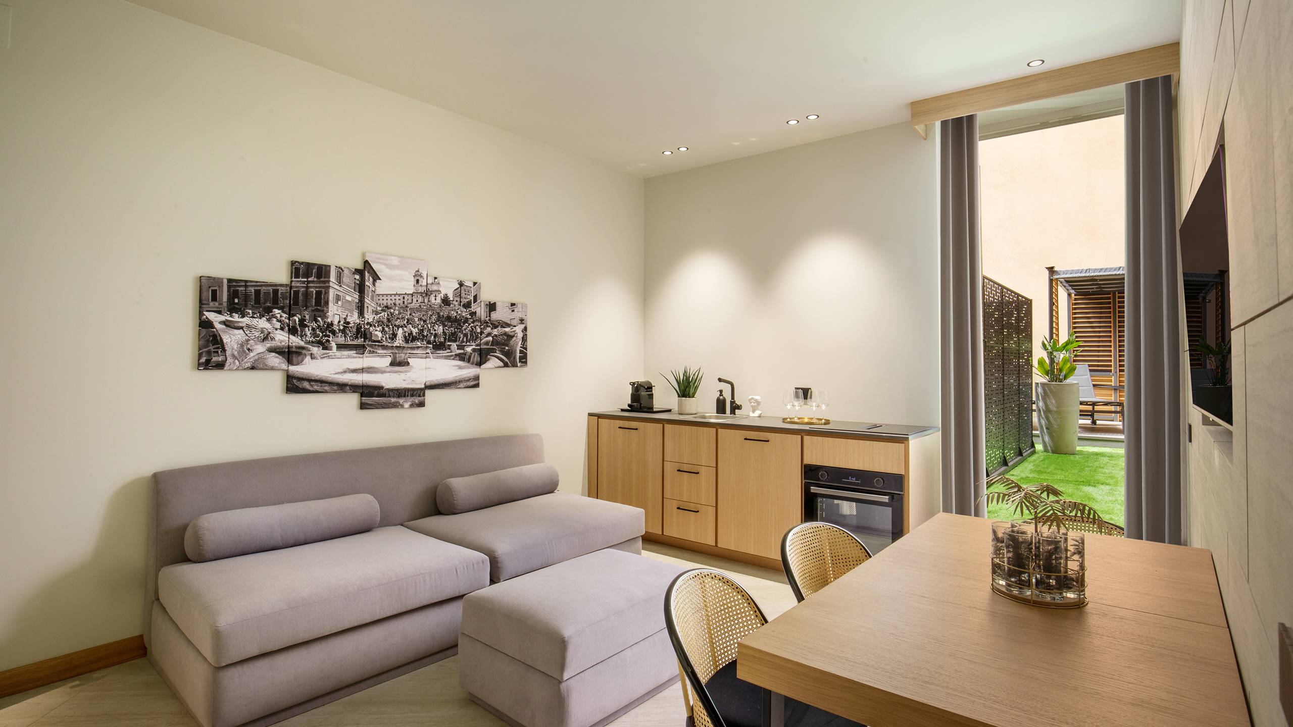 Ripetta Luxury Apartments represents excellence in hospitality, offering elegant and comfortable spaces for an unforgettable stay in Rome. The apartments have a generous area of 65 square meters, accommodating up to 4 people. They feature a bedroom, a bathroom with anteroom, a kitchen equipped with appliances and dishes, and a living room with sofa bed. Inside you will find a welcome kit, with Nespresso, kettle and various snacks.